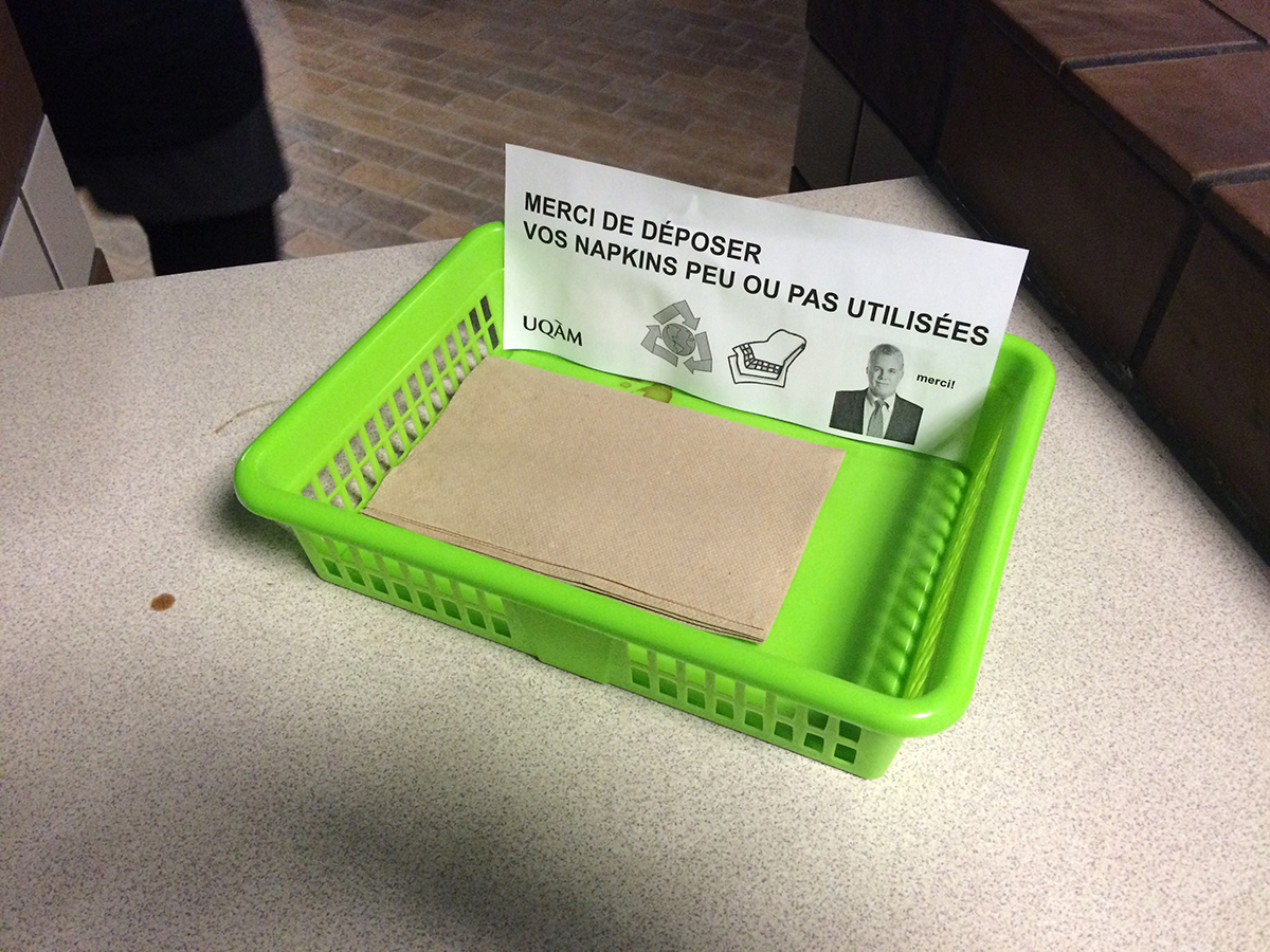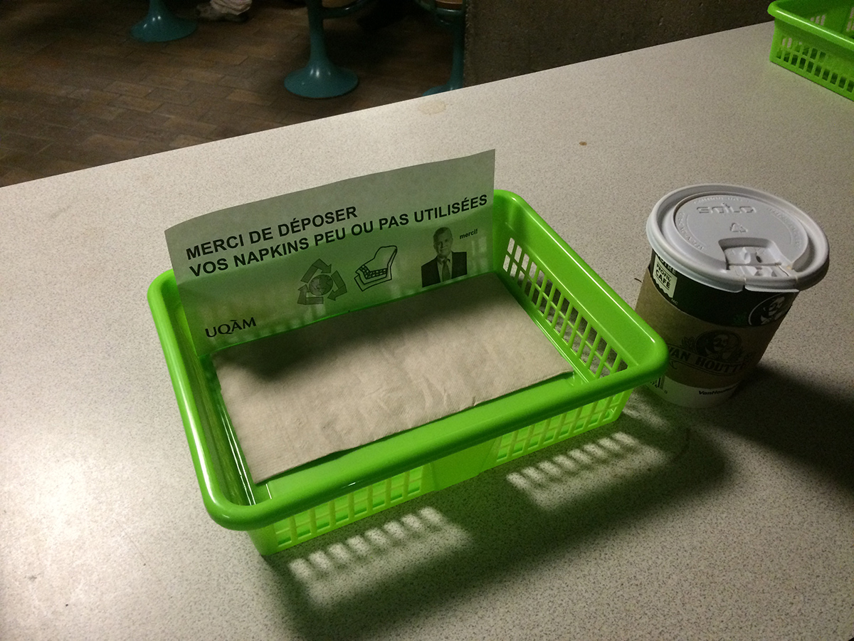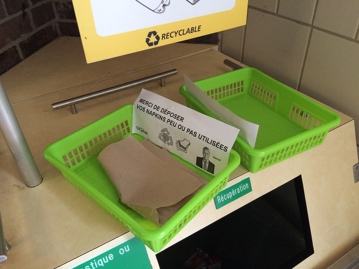 Alors qu’ils étaient employés de l’université, MeyerMetivier ont été invités par le syndicat des employés à produire une manoeuvre de perturbation dans le cadre des portes ouvertes de leur université. Cherchant à ternir l’image de l’établissement aux yeux des visiteurs venus pour la journé, les paniers de MeyerMetivier ont été déposés près des aires de tri dans la cafétéria de l’université afin de faire croire aux visiteurs que des mesures d’austérité drastiques étaient à l’oeuvre dans l’établissement. En demandant aux usagers de recycler leurs serviettes «peu ou pas utilisées» après leur repas, la manoeuvre de MeyerMetivier questionnait la valeur potentielle d’un objet ayant peu ou pas servi, dans un milieu académique se disant ouvert au progrès, et sensible à la cause environnementale. À la surprise des artistes, les paniers sont restés durant toute la session d’hiver, entretenus par une équipe de bénévoles anonymes. Vers la fin de la session, les caissières de la cafétéria s’étaient appropriées les paniers, dans lesquels elles déposent désormais les reçus de ventes que leurs clients refusent.