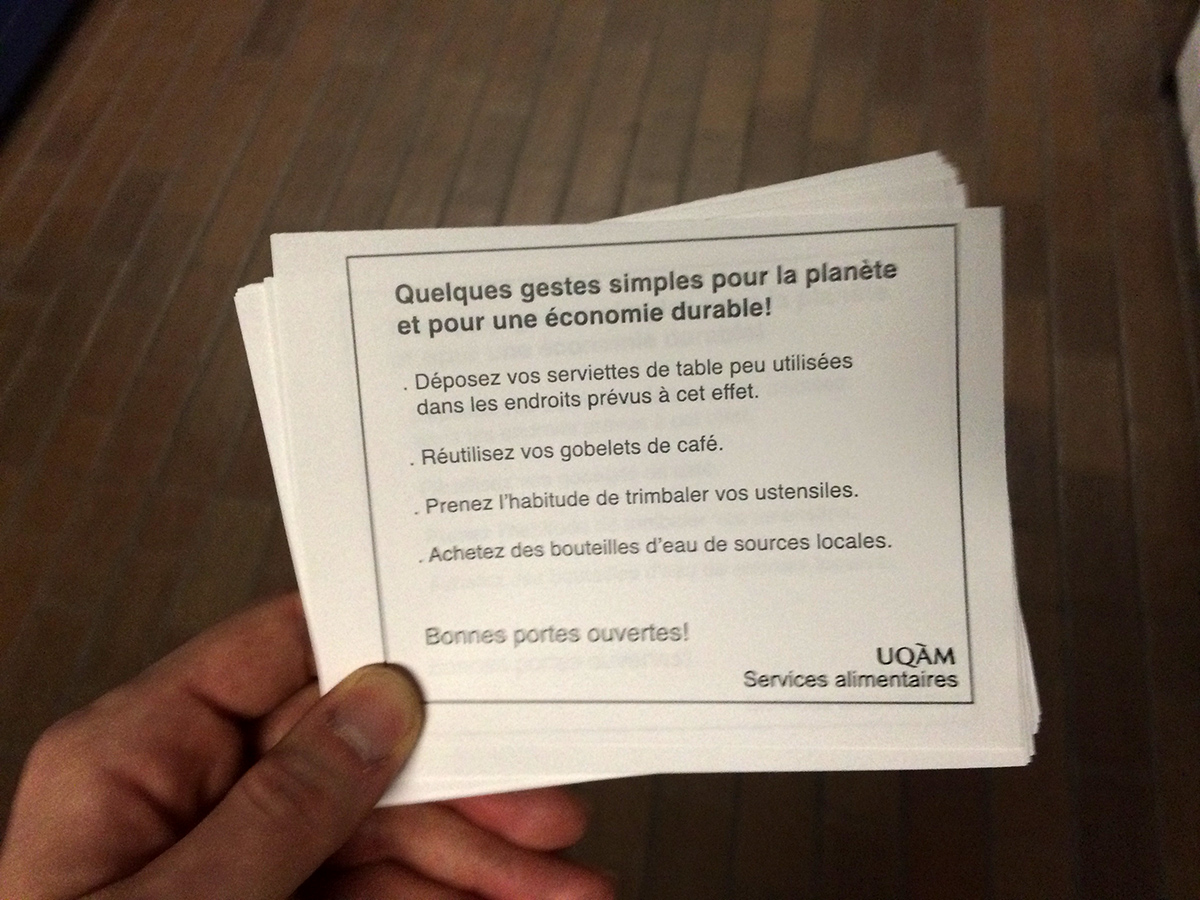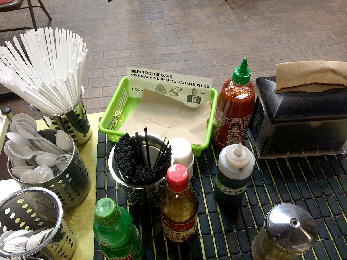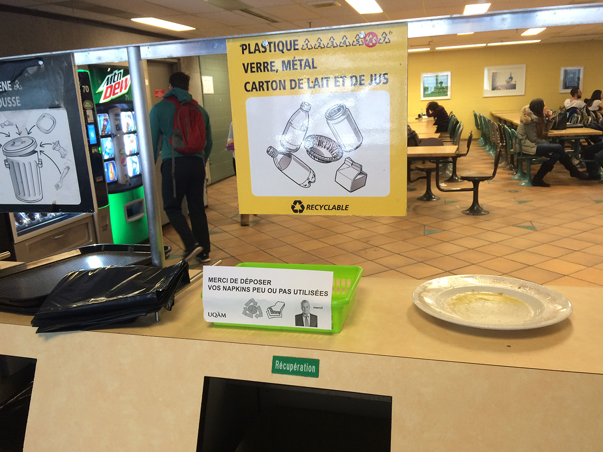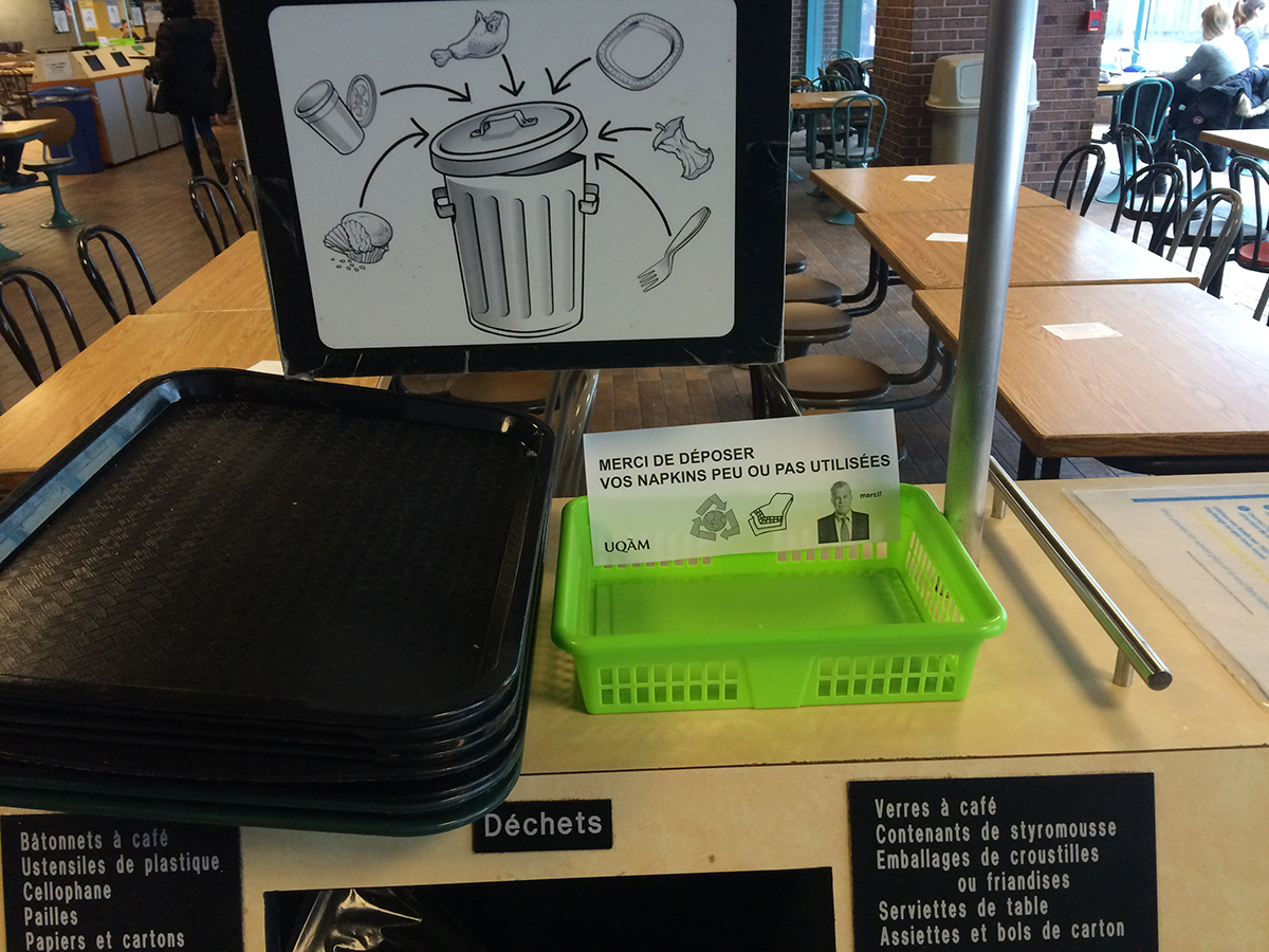 Alors qu’ils étaient employés de l’université, MeyerMetivier ont été invités par le syndicat des employés à produire une manoeuvre de perturbation dans le cadre des portes ouvertes de leur université. Cherchant à ternir l’image de l’établissement aux yeux des visiteurs venus pour la journé, les paniers de MeyerMetivier ont été déposés près des aires de tri dans la cafétéria de l’université afin de faire croire aux visiteurs que des mesures d’austérité drastiques étaient à l’oeuvre dans l’établissement. En demandant aux usagers de recycler leurs serviettes «peu ou pas utilisées» après leur repas, la manoeuvre de MeyerMetivier questionnait la valeur potentielle d’un objet ayant peu ou pas servi, dans un milieu académique se disant ouvert au progrès, et sensible à la cause environnementale. À la surprise des artistes, les paniers sont restés durant toute la session d’hiver, entretenus par une équipe de bénévoles anonymes. Vers la fin de la session, les caissières de la cafétéria s’étaient appropriées les paniers, dans lesquels elles déposent désormais les reçus de ventes que leurs clients refusent.
