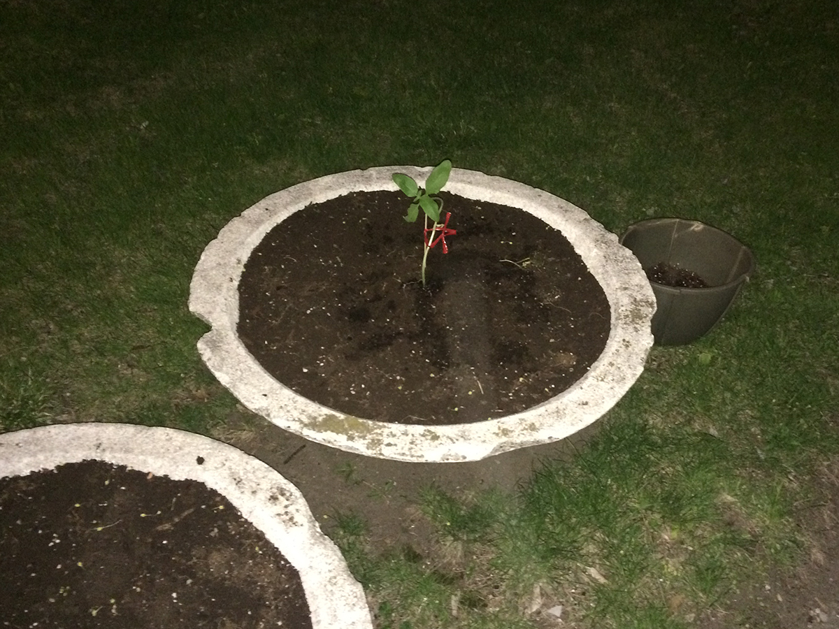 En mai, lorsque les dangers des gels nocturnes étaient passés, le duo d’artiste a procédé à une transplantation des tournesols. Les endroits ciblés pour les fleurs sont tous différents, et transgressent tous à leur façon, les limites de leur voisinage. Jusqu’à présent, les endroits où ont été plantés des tournesols sont: