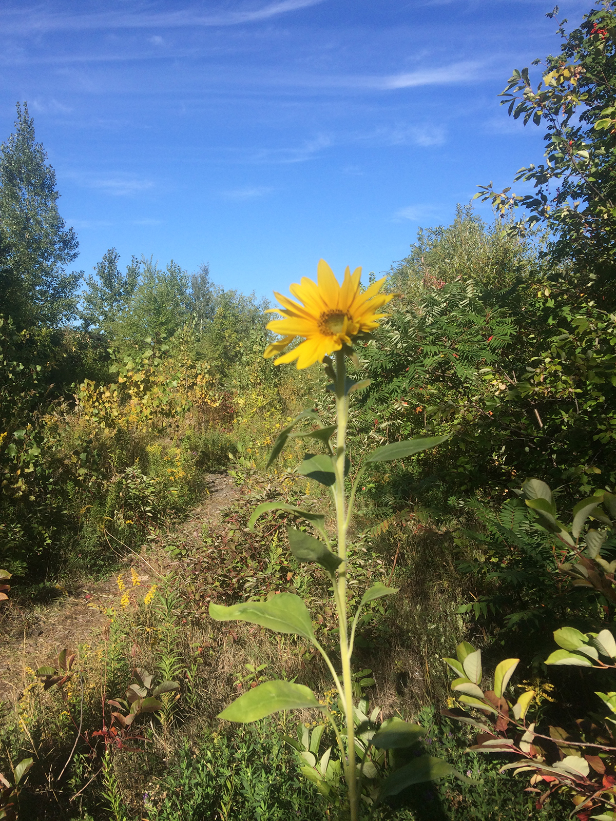 Le choix du tournesol s’est fait pour plusieurs raisons. Il s’agit d’abord d’une plante de qualité sculpturale qui peut atteindre des hauteurs semi-arborescentes qu’on voit rarement chez une fleur (jusqu’à 3 mètres!). Parfois surnommés Soleil ou Grand soleil, les pétales agissent comme une forme signalétique très efficace qui réfère à l’astre autour duquel nous gravitons. À côté d’un tournesol, un humain peut se sentir très petit : une part de nous est émerveillée par la beauté de la nature et par son aspect sain et positif, tandis qu’on peut se sentir déstabilisé par la disproportion de la plante. Avec son centre rond et foncé, la tête de la fleur ressemble elle-même à un oeil, formé d’après son grand référent, le soleil. Lié à cette iconographie, le tournesol est majoritairement associé au réconfort, au progrès et à la croissance. Toutefois, son apparence curieuse renvoie également à l’ambiguïté propre au soleil, résidant dans son origine cosmique et menaçante. Sans l’amortissement des rayons solaires par la membrane gazeuse de notre planète, le tournesol ne pourrait pas suivre le soleil sur son trajet sans brûler ou étouffer immédiatement.