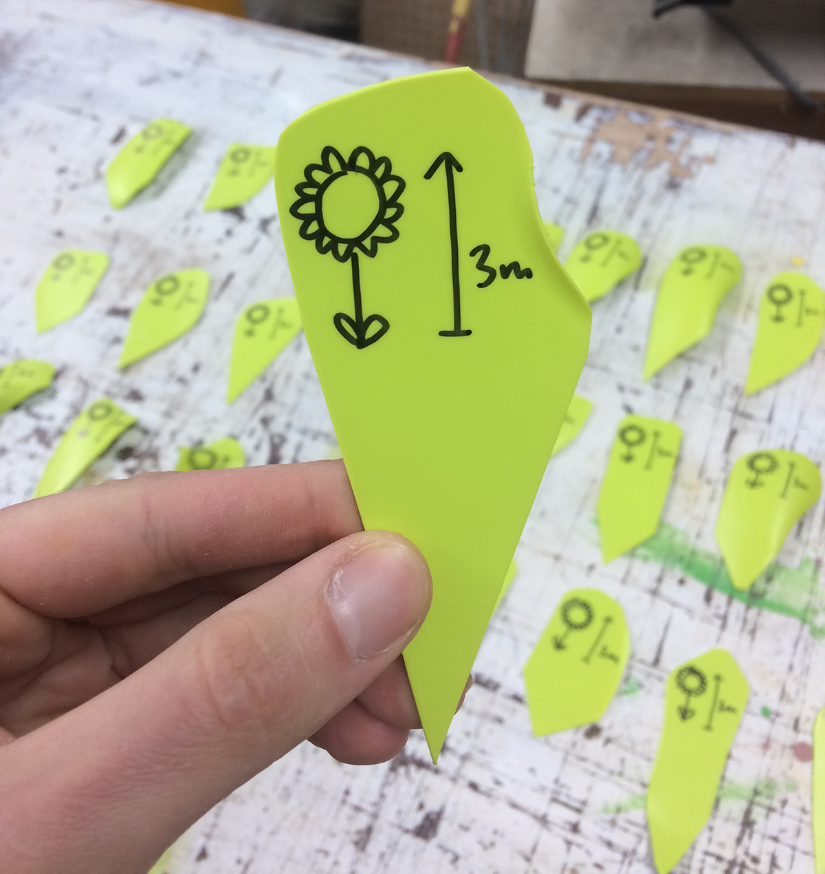 Le choix du tournesol s’est fait pour plusieurs raisons. Il s’agit d’abord d’une plante de qualité sculpturale qui peut atteindre des hauteurs semi-arborescentes qu’on voit rarement chez une fleur (jusqu’à 3 mètres!). Parfois surnommés Soleil ou Grand soleil, les pétales agissent comme une forme signalétique très efficace qui réfère à l’astre autour duquel nous gravitons. À côté d’un tournesol, un humain peut se sentir très petit : une part de nous est émerveillée par la beauté de la nature et par son aspect sain et positif, tandis qu’on peut se sentir déstabilisé par la disproportion de la plante. Avec son centre rond et foncé, la tête de la fleur ressemble elle-même à un oeil, formé d’après son grand référent, le soleil. Lié à cette iconographie, le tournesol est majoritairement associé au réconfort, au progrès et à la croissance. Toutefois, son apparence curieuse renvoie également à l’ambiguïté propre au soleil, résidant dans son origine cosmique et menaçante. Sans l’amortissement des rayons solaires par la membrane gazeuse de notre planète, le tournesol ne pourrait pas suivre le soleil sur son trajet sans brûler ou étouffer immédiatement.